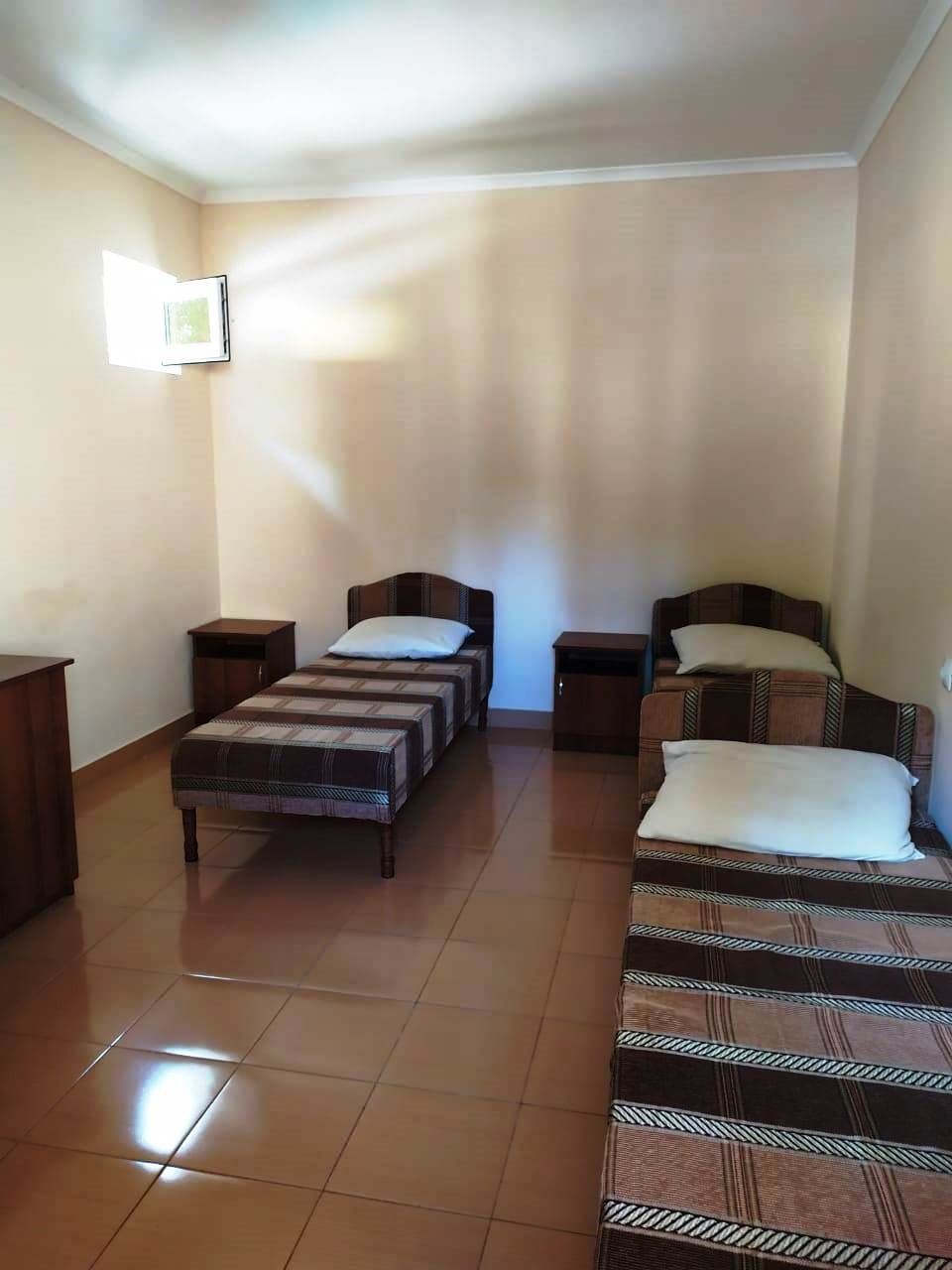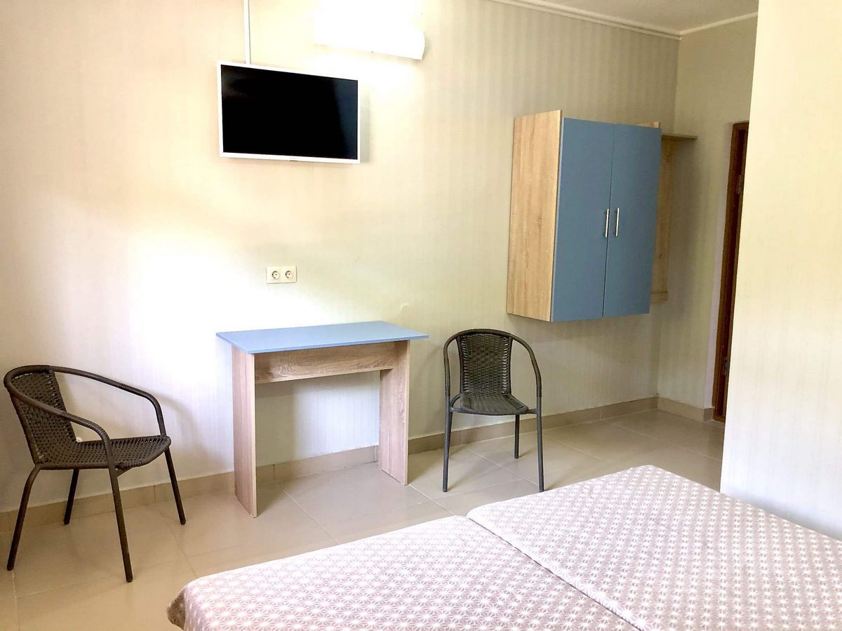 Оснащение номеров: односпальные или двуспальные кровати, прикроватные тумбочки, стол, стул, шкаф для одежды, холодильник, кондиционер, телевизор