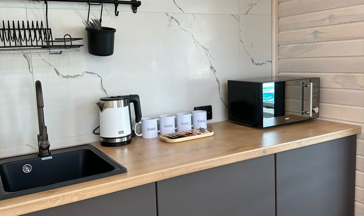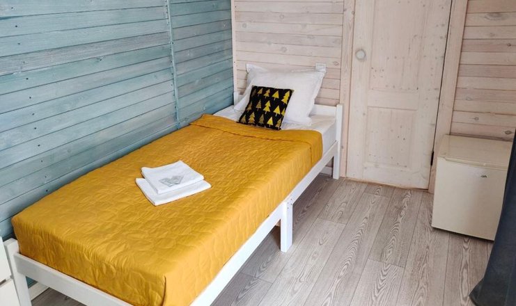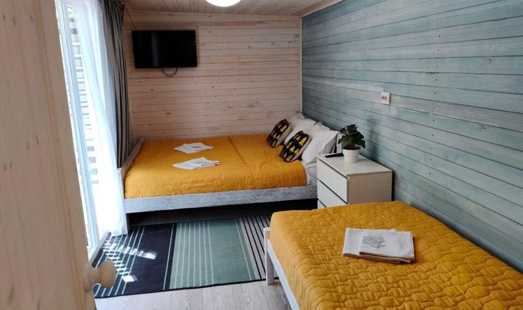 В доме: кресло-кровать, кровать двуспальная: 1 шт., кровать двухъярусная, прикроватный столик, стол, мини-кухня, микроволновая печь, набор посуды, телевизор, холодильник, электрочайник