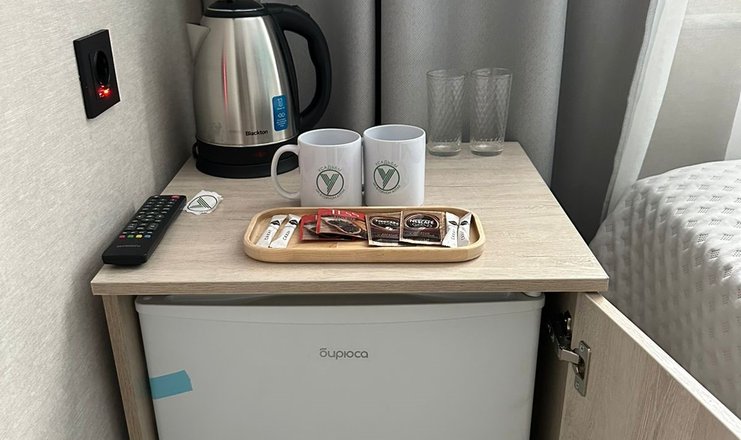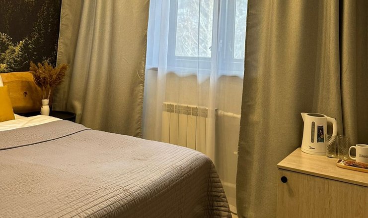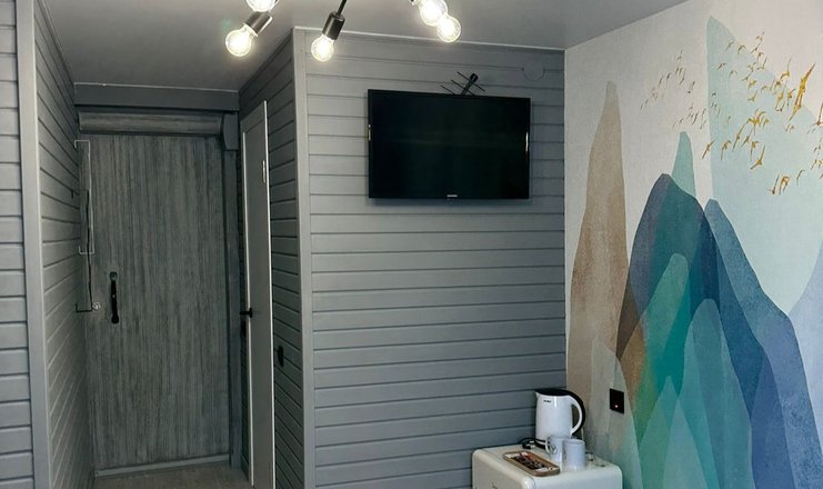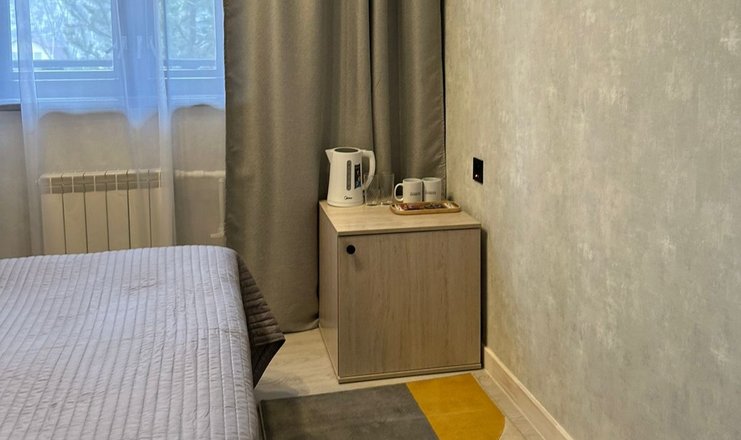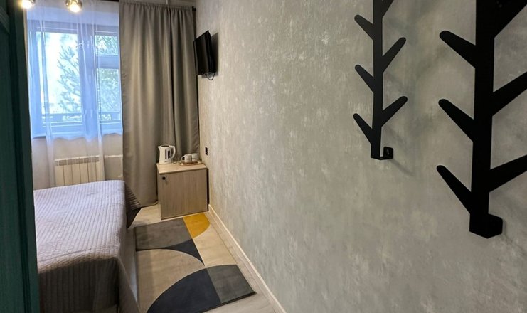 В номере: кровать двуспальная, прикроватные тумбочки, тумба, телевизор, холодильник, электрочайник