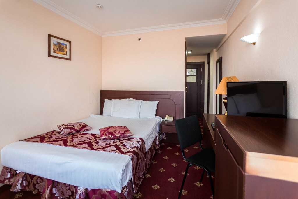В номере: кровать полутороспальная, прикроватная тумбочка, стол, стул, шкаф, кондиционер, телевизор, телефон, сейф