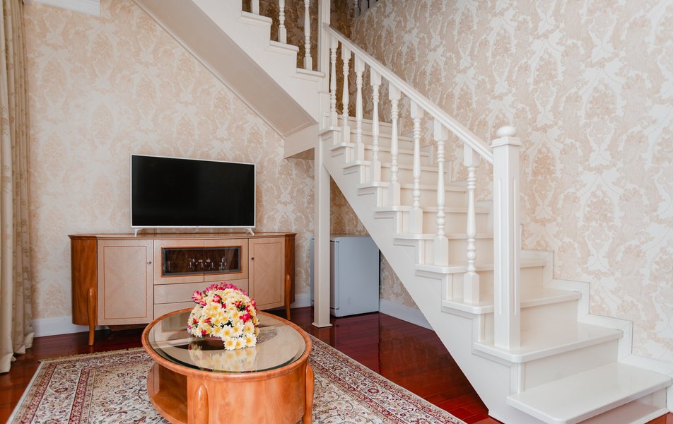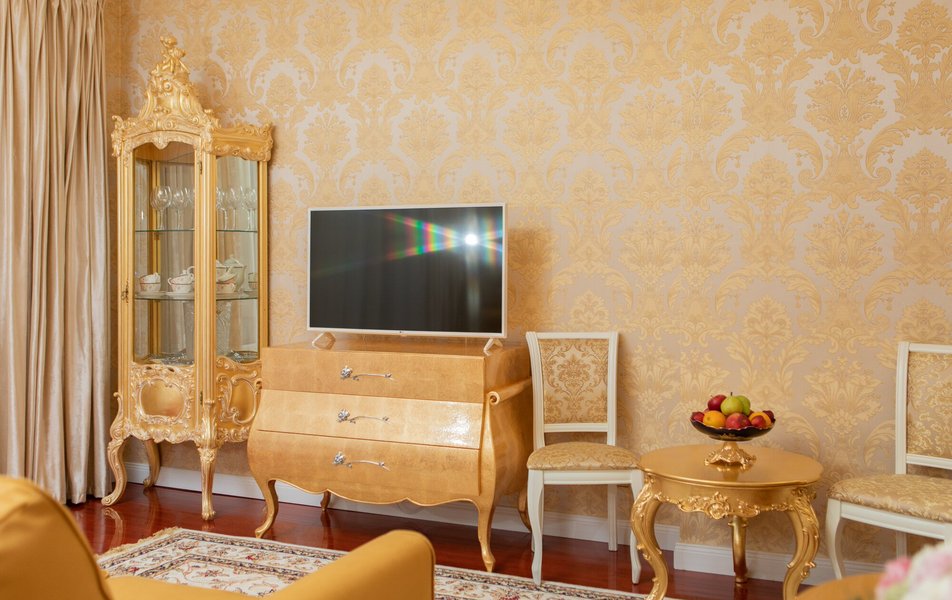В номере: диван, комод, набор мягкой мебели, прикроватные тумбочки, стол, стулья, шкаф для посуды, кондиционер, телевизор, холодильник, электрочайник