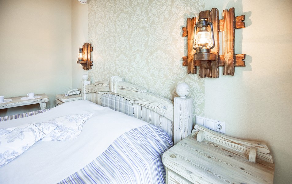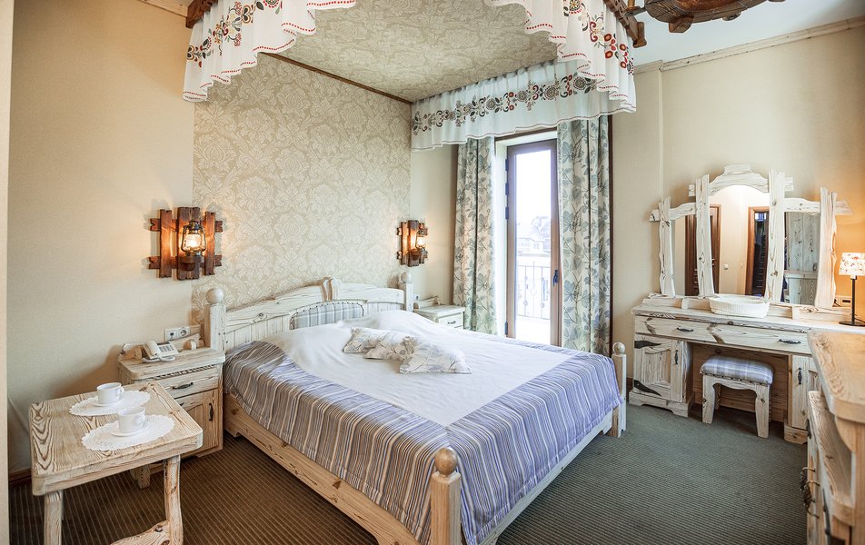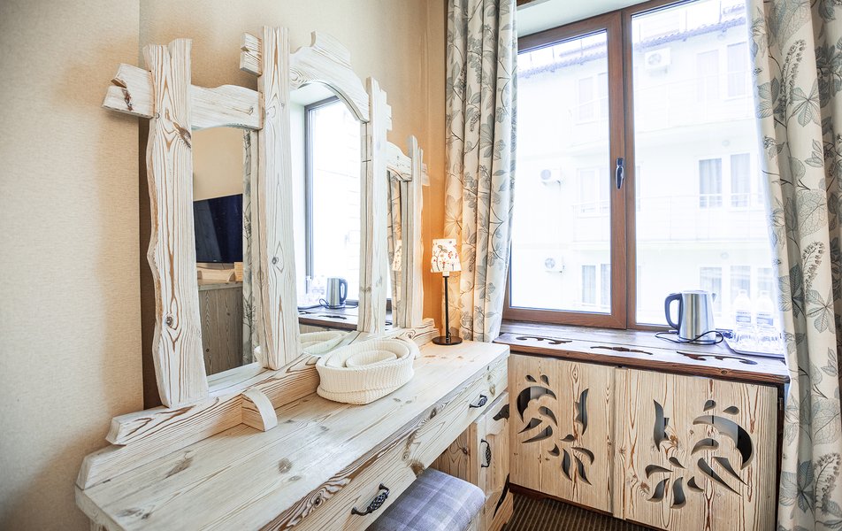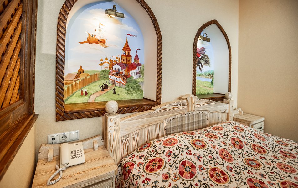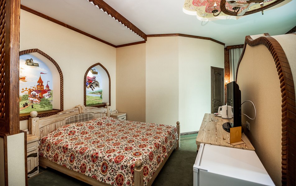 В номере: кровать двуспальная, прикроватные тумбочки, столик туалетный, стул, шкаф, кондиционер, мини-холодильник, набор посуды, сейф, телевизор ЖК, телефон, электрочайник