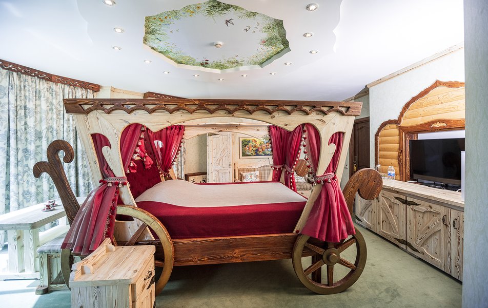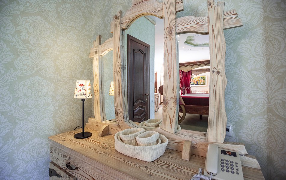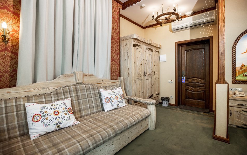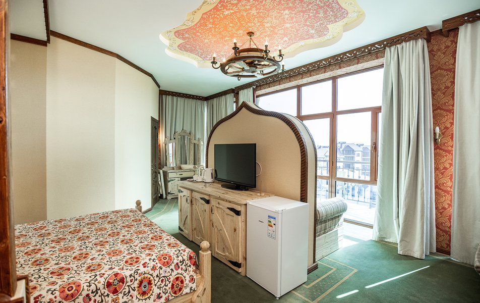 В номере: диван, кресла, кровать двуспальная, прикроватные тумбочки, стол, стул, шкаф, кондиционер, мини-холодильник, набор посуды, сейф, телевизор ЖК, телефон, электрочайник