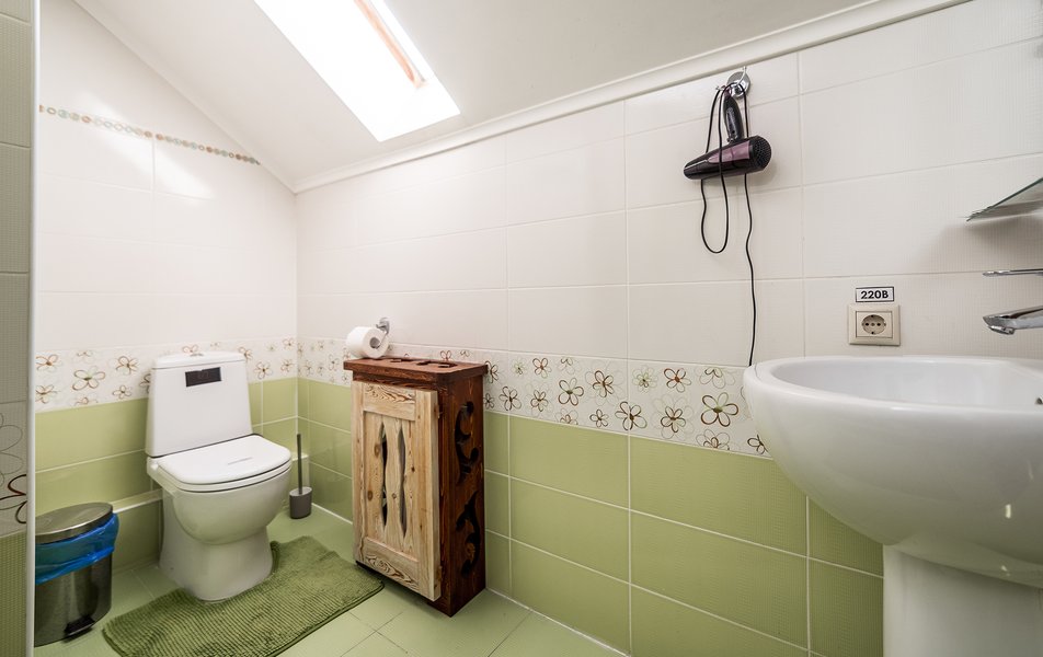 Санузел: душ, раковина, унитаз, туалетные принадлежности, фен