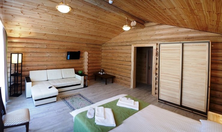В номере: Кухня, вешалка, диван, зеркало, кровати односпальные, кровать двуспальная, прикроватные тумбочки, стол, стулья, шкаф, микроволновая печь, набор посуды, плита электрическая, телевизор ЖК, чайный набор посуды, электрочайник