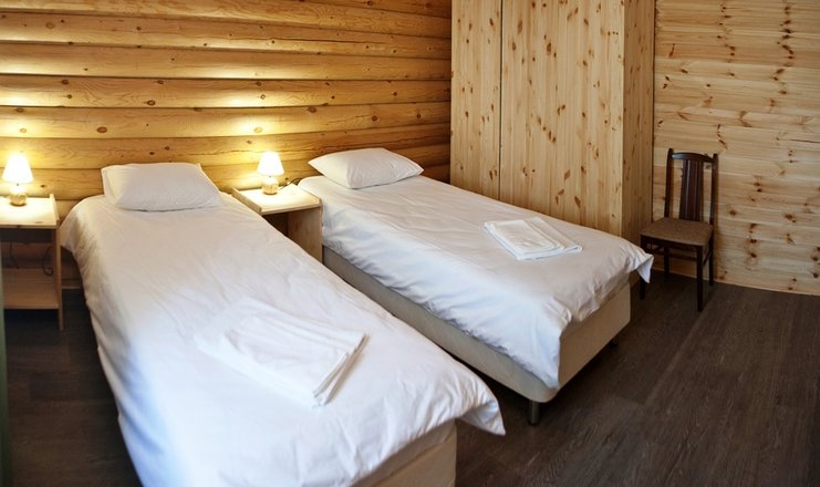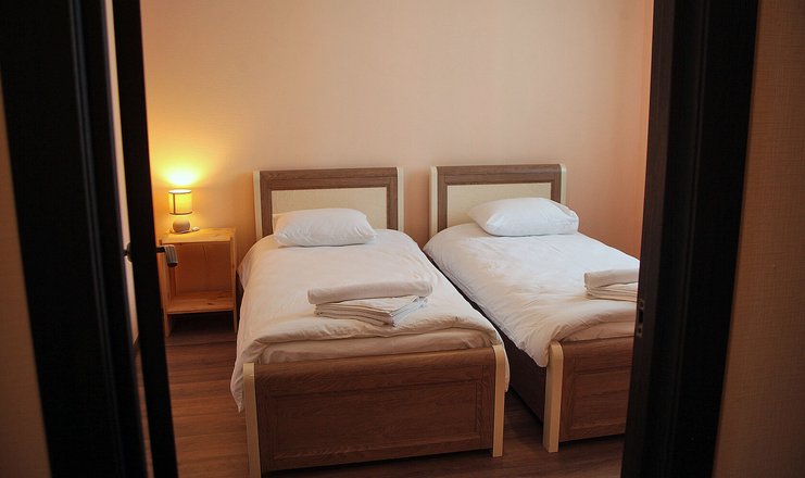 В номере: Кухня вешалка, зеркало, кровати односпальные, кровать двуспальная, прикроватные тумбочки, стол, стулья, шкаф, микроволновая печь, набор посуды, плита электрическая, телевизор ЖК, чайный набор посуды, электрочайник